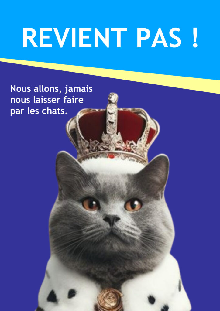 Vous avez sans doute vu cette affiche, ici à droite. Elle a été faite par l’association PP (Paix Partout). Elle a été mise partout dans le pays, pour montrer la colère envers le Royaume Des Chats.